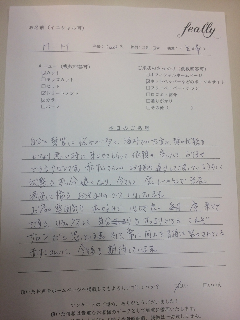 赤松さんのおすすめ通りにして頂いているうちに状態もずいぶん良くなり、今では全くノープランで来店し、満足して帰るお決まりのコースとなっています。