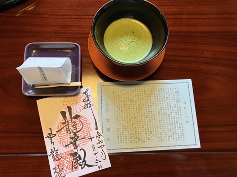 - 神社でお抹茶をいただきました。御朱印を集めています。