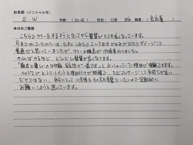 こちらでカラーをするようになってから髪質がとても良くなっています。今までやっていたカラーは、たまにしみたり2〜3日はかゆみが出たりダメージして普通だと思っていましたが、カラーの概念が180度変わりました。やればやるほど、どんどん髪質が良くなります。「頭皮に優しいのは勿論、安全性が一番です」とおっしゃっていた理由が理解出来ます。ヘッドスパとトリートメントも理由付けが明確で、ただマッサージして気持ち良いだけではない、自分にとって10年後もその先も美髪でいたいので定期的にお願いしようと思ってます。
