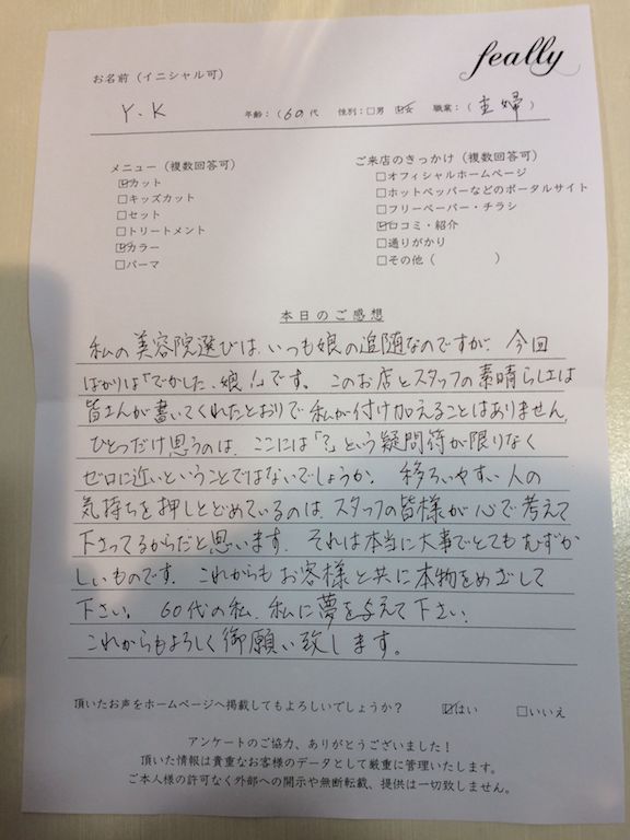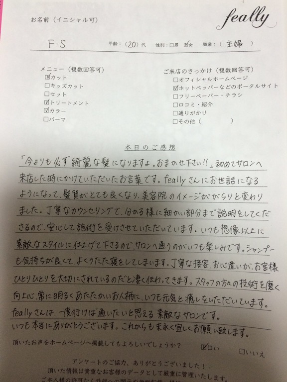 初めてサロンに来店した時にかけて頂いたお言葉です。feallyさんにお世話になるようになって、髪質がとても良くなり美容院のイメージがガラリと変わりました。丁寧なカウンセリングでわかるように細かい部分まで説明して下さるので安心して施術を受けさせて頂いています。いつも想像以上に素敵なスタイルに仕上げて下さるのでサロンに通うのがいつも楽しみです。シャンプーも気持ちが良くてよくうたた寝をしてしまいます。丁寧な接客、お心遣いがお客様ひとりひとりを大切にされているのだと凄く伝わってきます。スタッフの方々の技術を磨く向上心、常に明るく温かいお人柄にいつも元気と癒しを頂いております。feallyさんは一度行けば通いたいと思える素敵なサロンです。いつも本当にありがとうございます。これからも末永く宜しくお願い致します。