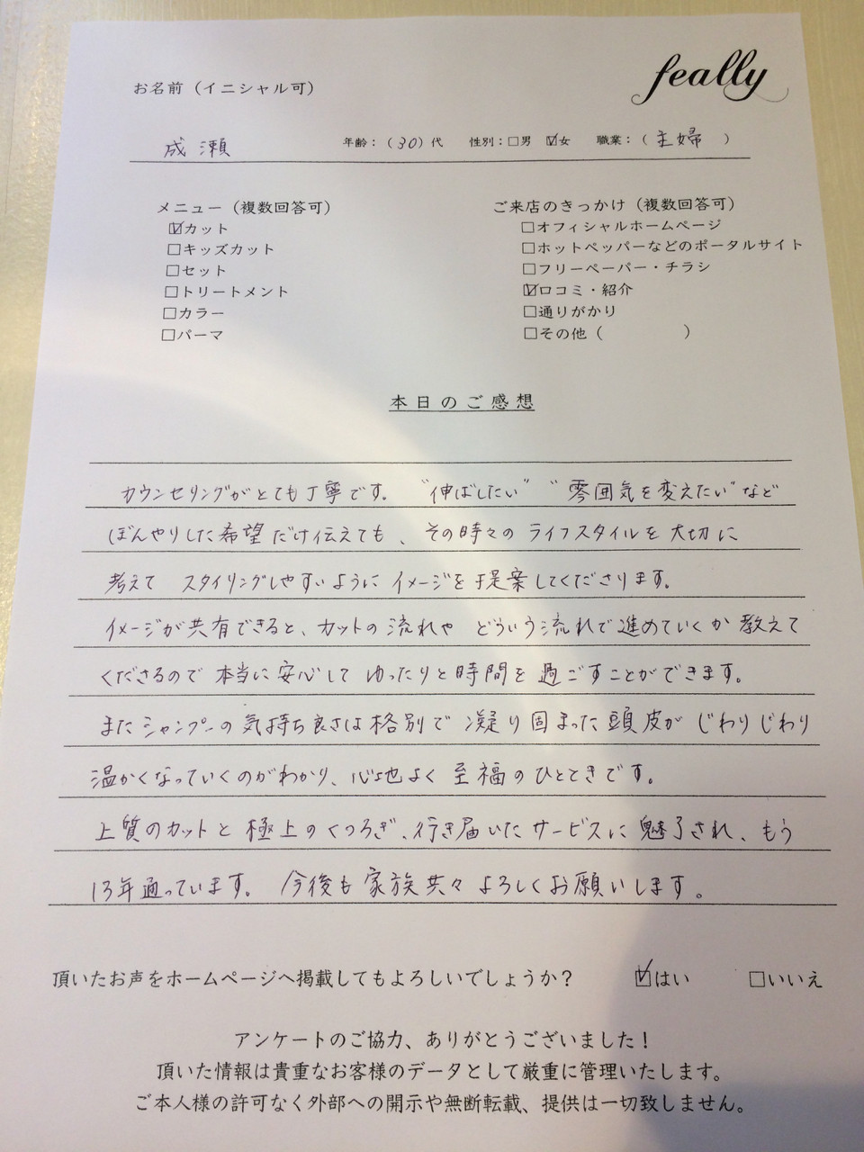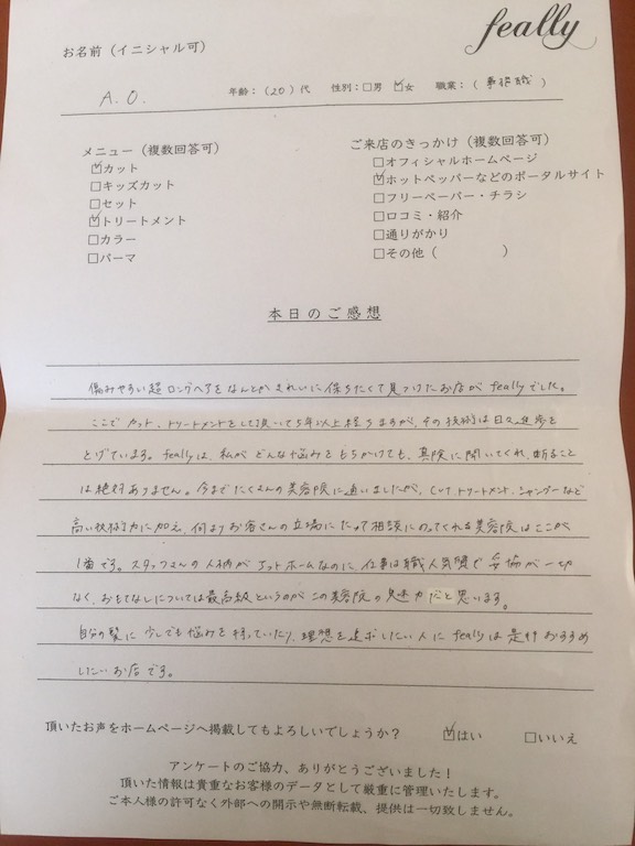ここでカット、トリートメントをして頂いて5年以上経ちますがその技術は日々進歩をとげています。feallyは、私がどんな悩みをもちかけても、真剣に聞いてくれ、断ることは絶対ありません。今までたくさんの美容院に通いましたが、cut、トリートメント、シャンプーなど高い技術力に加え、何よりお客さんの立場にたって相談にのってくへる美容院はここが1番です。スタッフさんの人柄がアットホームなのに仕事は職人気質で妥協が一切なくおもてなしについては最高級というのがこの美容院の魅力だと思います。