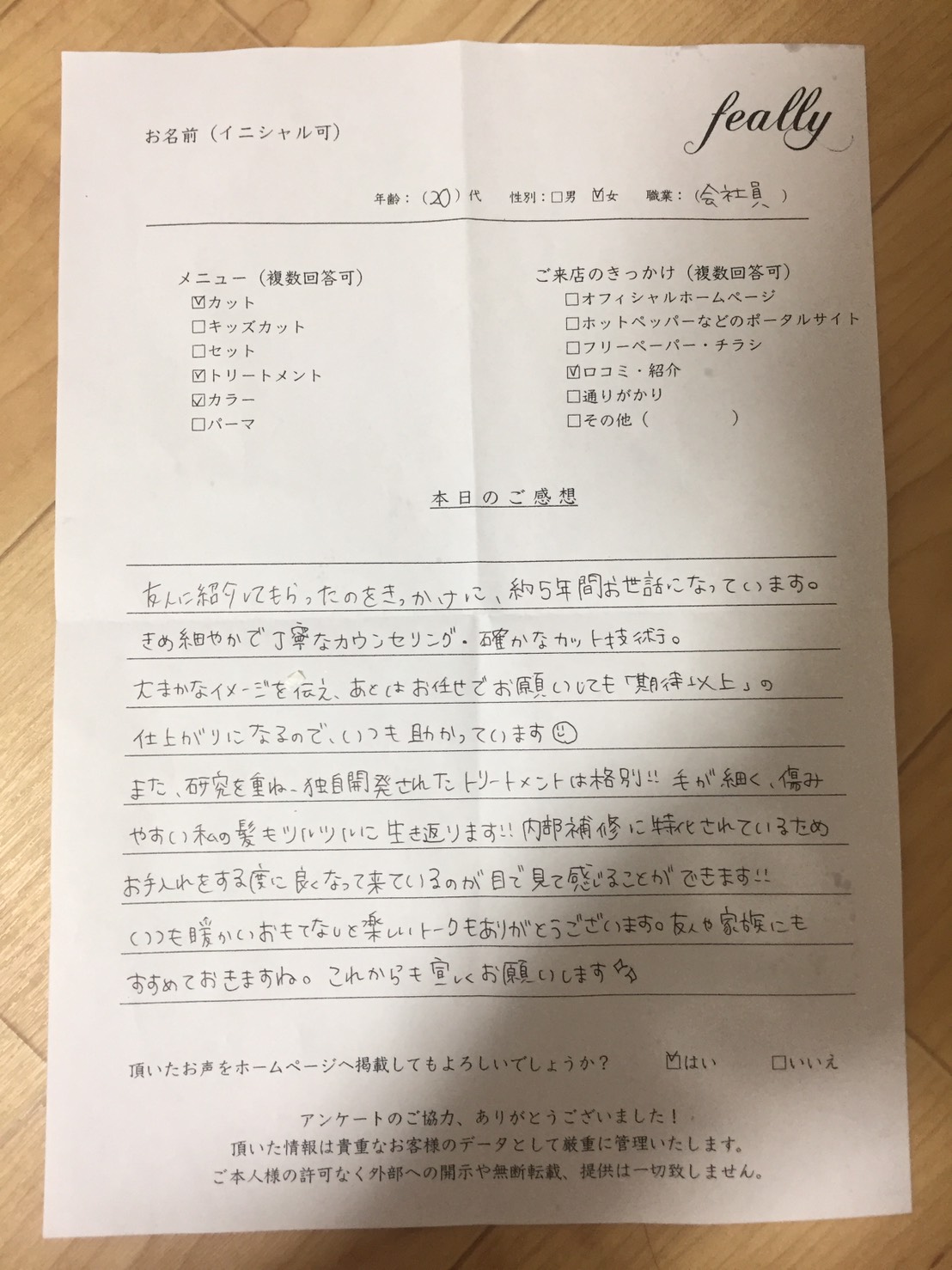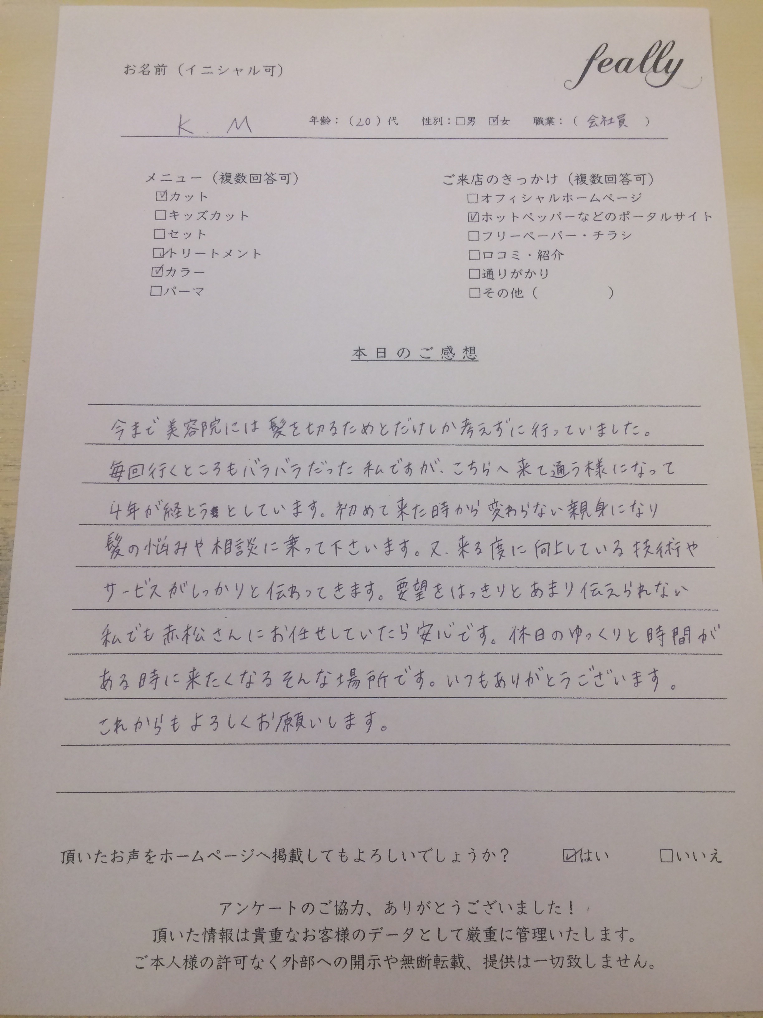 毎回行くところもバラバラだった私ですが、こちらへ来て通うようになって4年が経とうとしています。初めて来た時から変わらない親身になり髪の悩みや相談に乗って下さいます。又、来る度に向上している技術やサービスがしっかりと伝わってきます。要望をはっきりとあまり伝えられない私でも赤松さんにお任せしていたら安心です。休日のゆっくりと時間がある時に来たくなるそんな場所です。いつもありがとうございます。