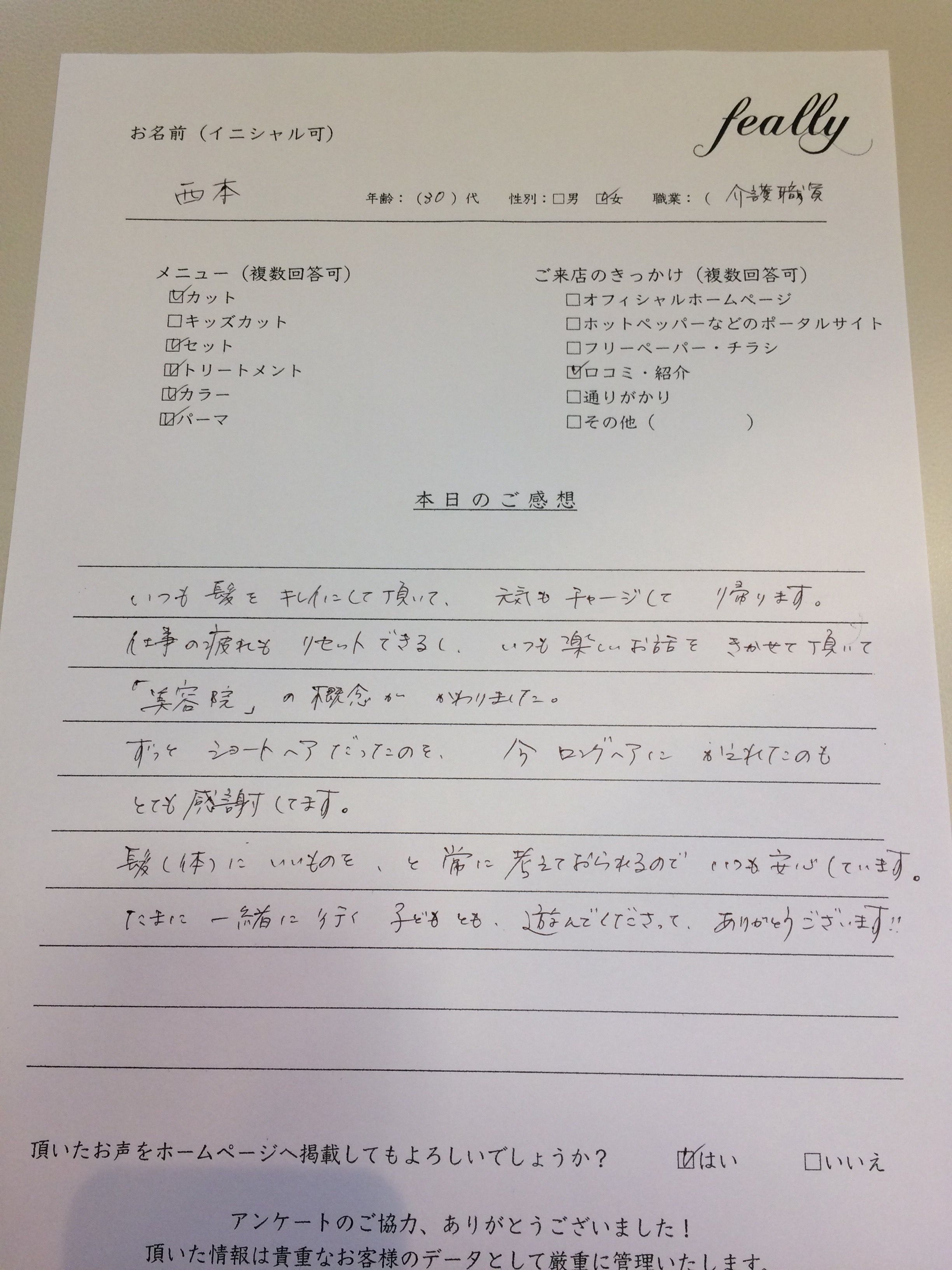 仕事の疲れもリセットできるし、いつも楽しいお話をきかせて頂いて「美容院」の概念が変わりました。ずっとショートヘアだったのを、今ロングヘアに変えれたのもとても感謝しています。髪(体)にいいものを、と常に考えておられるのでいつも安心しています。たまに一緒に行く子供とも遊んでくださってありがとうございます。
